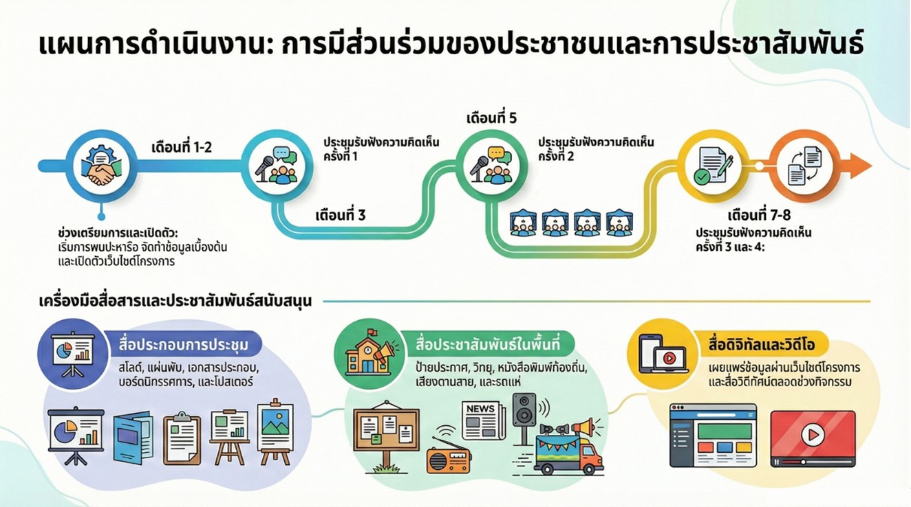 โดยทำการเผยแพร่ข้อมูลข่าวสาร จัดทำสื่อประชาสัมพันธ์ เช่น เอกสารประกอบการประชุม แผ่นพับ โปสเตอร์ปิดประกาศเชิญประชุม ชุดบอร์ดนิทรรศการเคลื่อนที่และสรุปผลการจัดกิจกรรมรับฟังความคิดเห็นแต่ละครั้ง รวมถึงการกระจายข้อมูลผ่านสื่อประชาสัมพันธ์ เสียงตามสายของชุมชน หรือแจ้งผ่านผู้นำท้องถิ่น