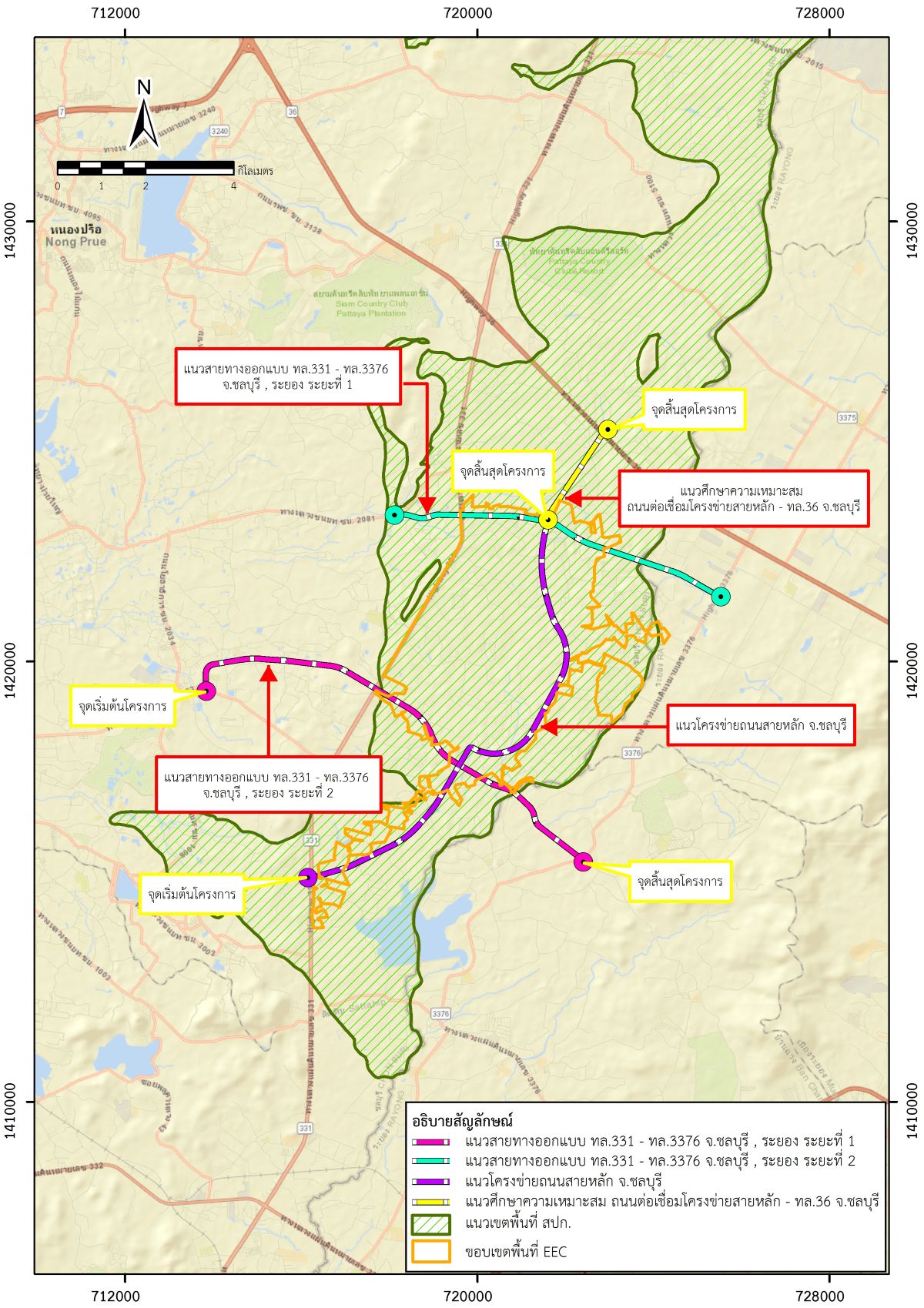 - สำรวจและออกแบบรายละเอียด ถนนโครงข่ายสายหลัก จ.ชลบุรี มีจุดเริ่มต้นที่ทางหลวงแผ่นดินหมายเลข 331 บริเวณ กม.ที่ 10+950 และมุ่งหน้าไปทางทิศเหนือ ตัดผ่านถนนท้องถิ่น (ซอยซากหมาก-บ้านสุวรรณ) จากนั้นมุ่งหน้าไปทางทิศเหนือไปสิ้นสุดโครงการที่ถนนสายแยก ทล.331 - ทล.3376 จ.ชลบุรี, ระยอง ระยะที่ 1 บริเวณ กม.ที่ 3+477 ทิศเหนือไปสิ้นสุกโครงการที่ถนนสายแยก ทล.331 - ทล.3376 จ.ชลบุรี, ระยอง ระยะที่ 1 บริเวณ กม.ที่ 3+477